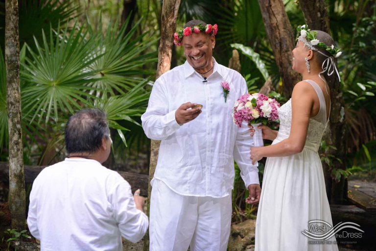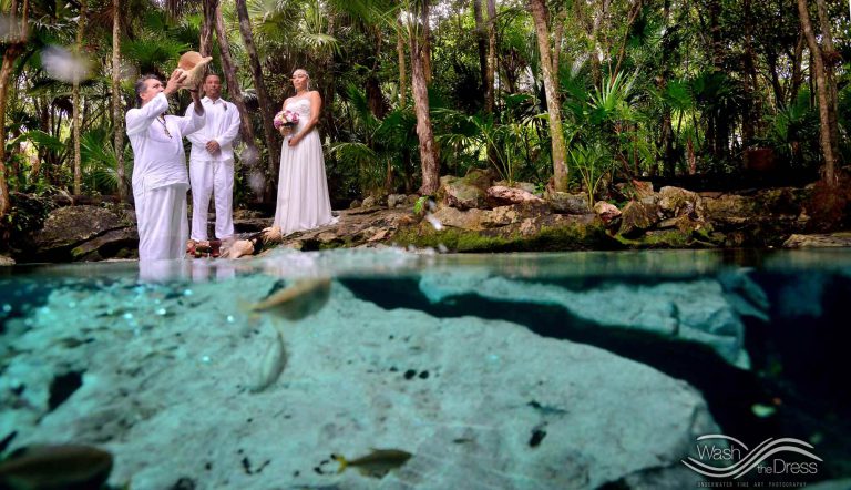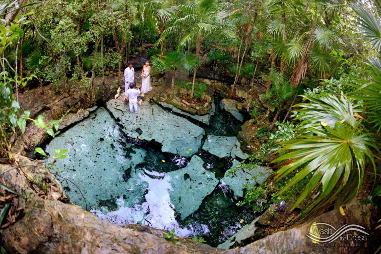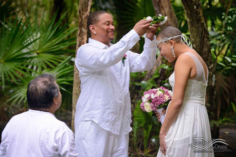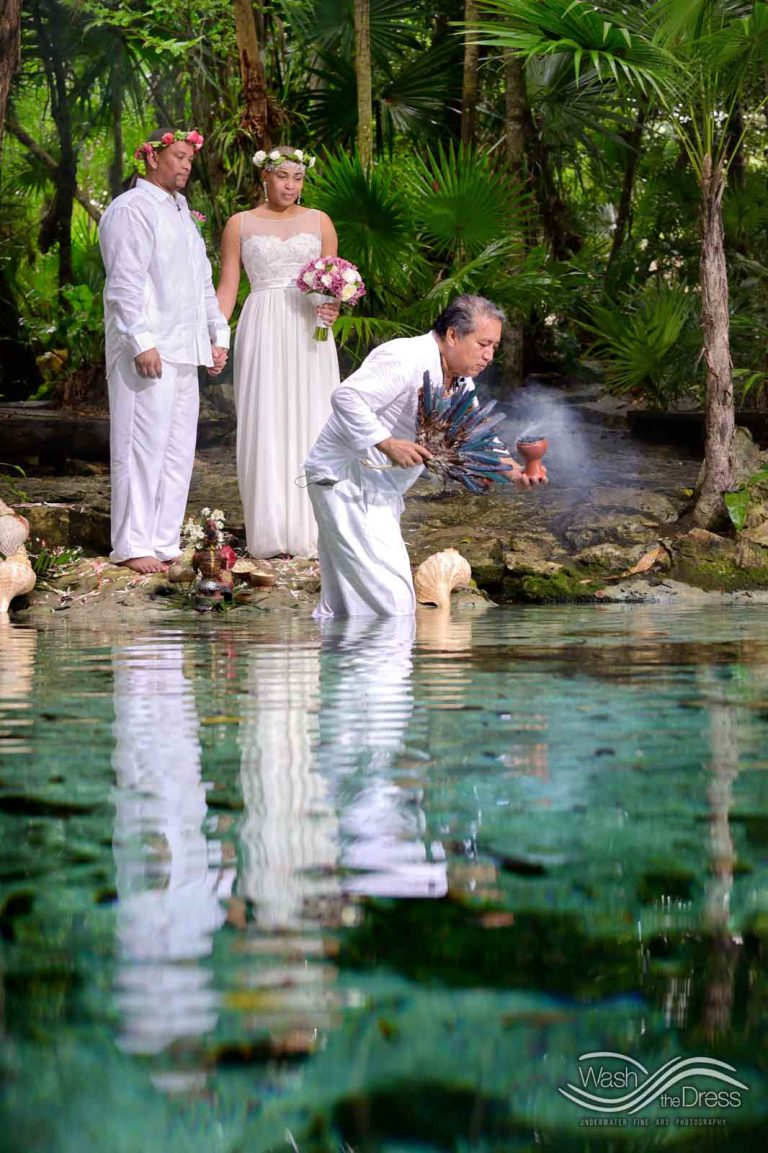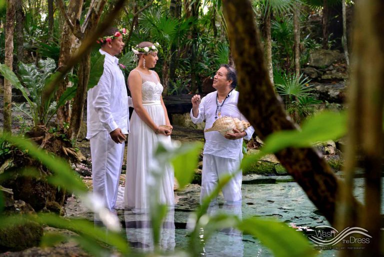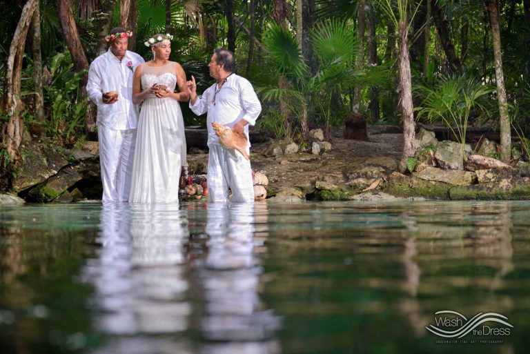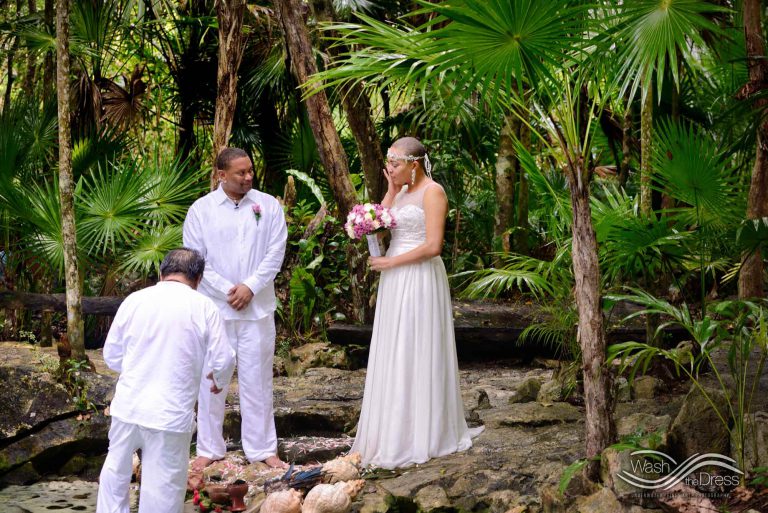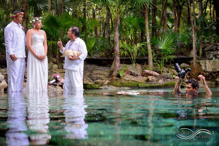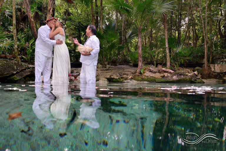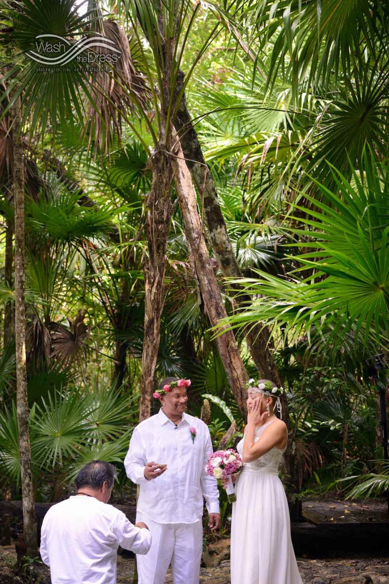 Shareefah and Victor came to Cancun to get married at an intimate ceremony at a cenote. The ceremony was conducted by a Maya shaman. A ray of sunlight passed between the trees during the ceremony and shone directly on the couple – it was a magical moment in the heart of the Mexican jungle. Of course, after the ceremony we also did a photo shoot in the waters of the cenote.