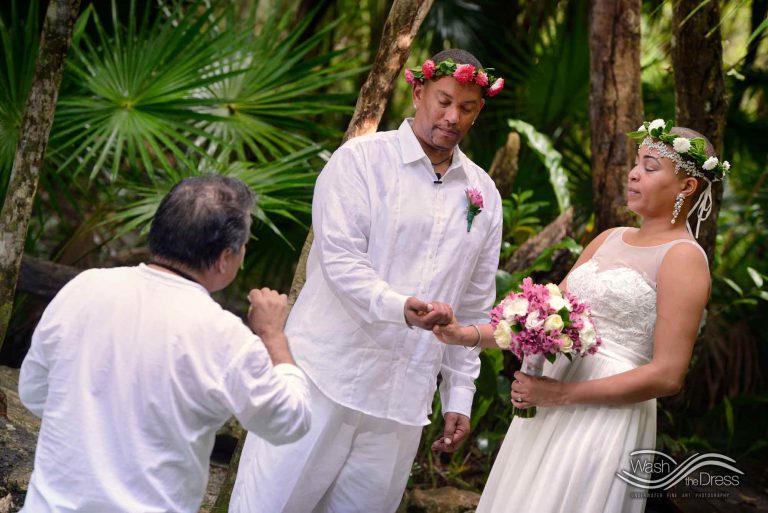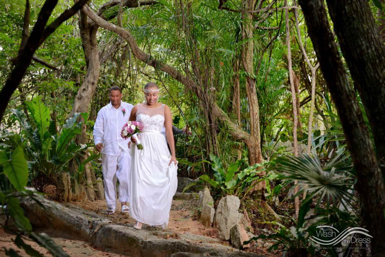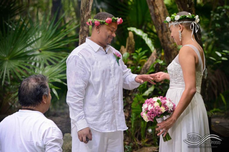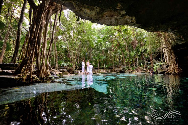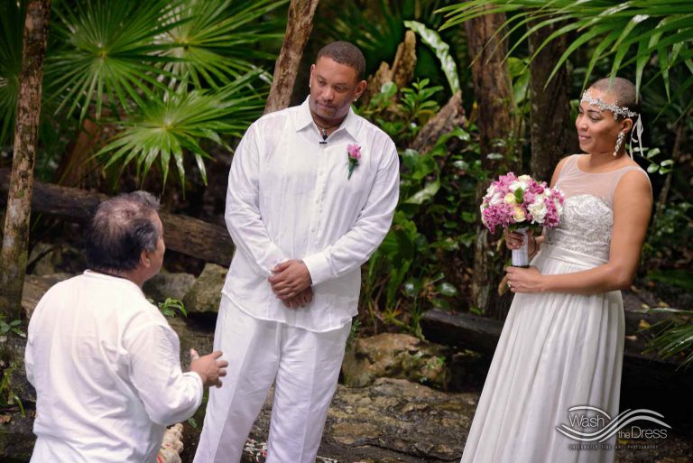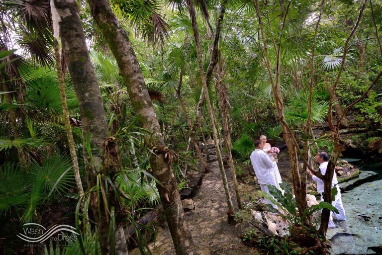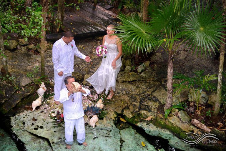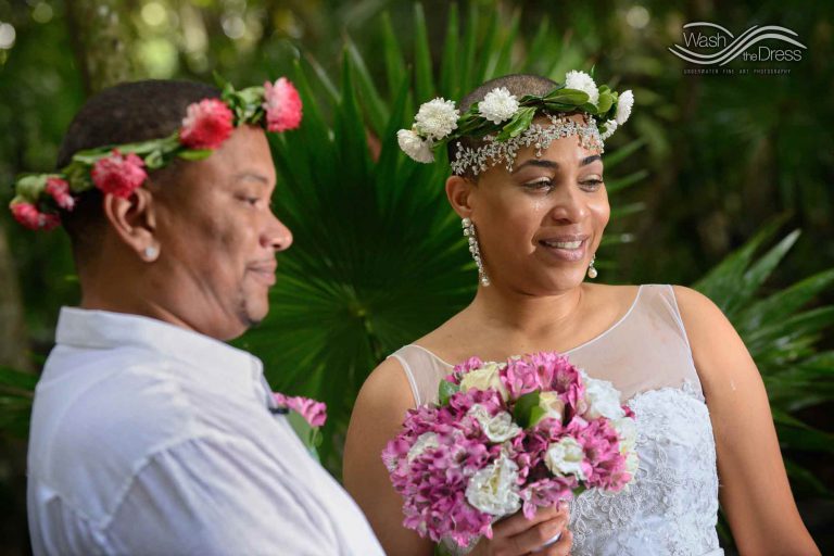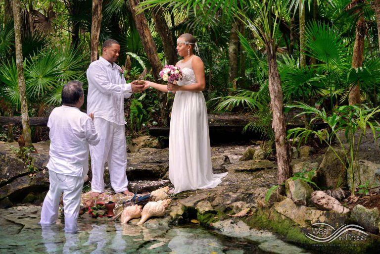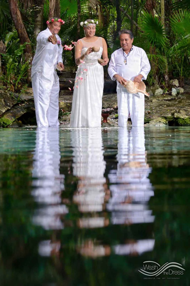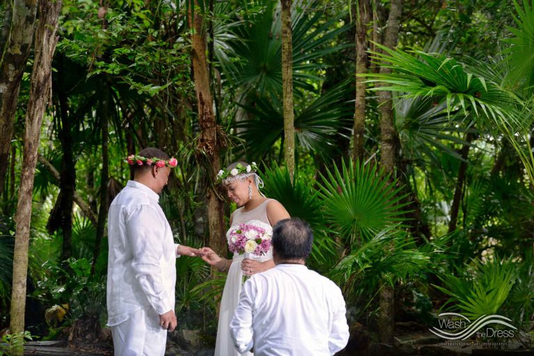 Shareefah and Victor came to Cancun to get married at an intimate ceremony at a cenote. The ceremony was conducted by a Maya shaman. A ray of sunlight passed between the trees during the ceremony and shone directly on the couple – it was a magical moment in the heart of the Mexican jungle. Of course, after the ceremony we also did a photo shoot in the waters of the cenote.