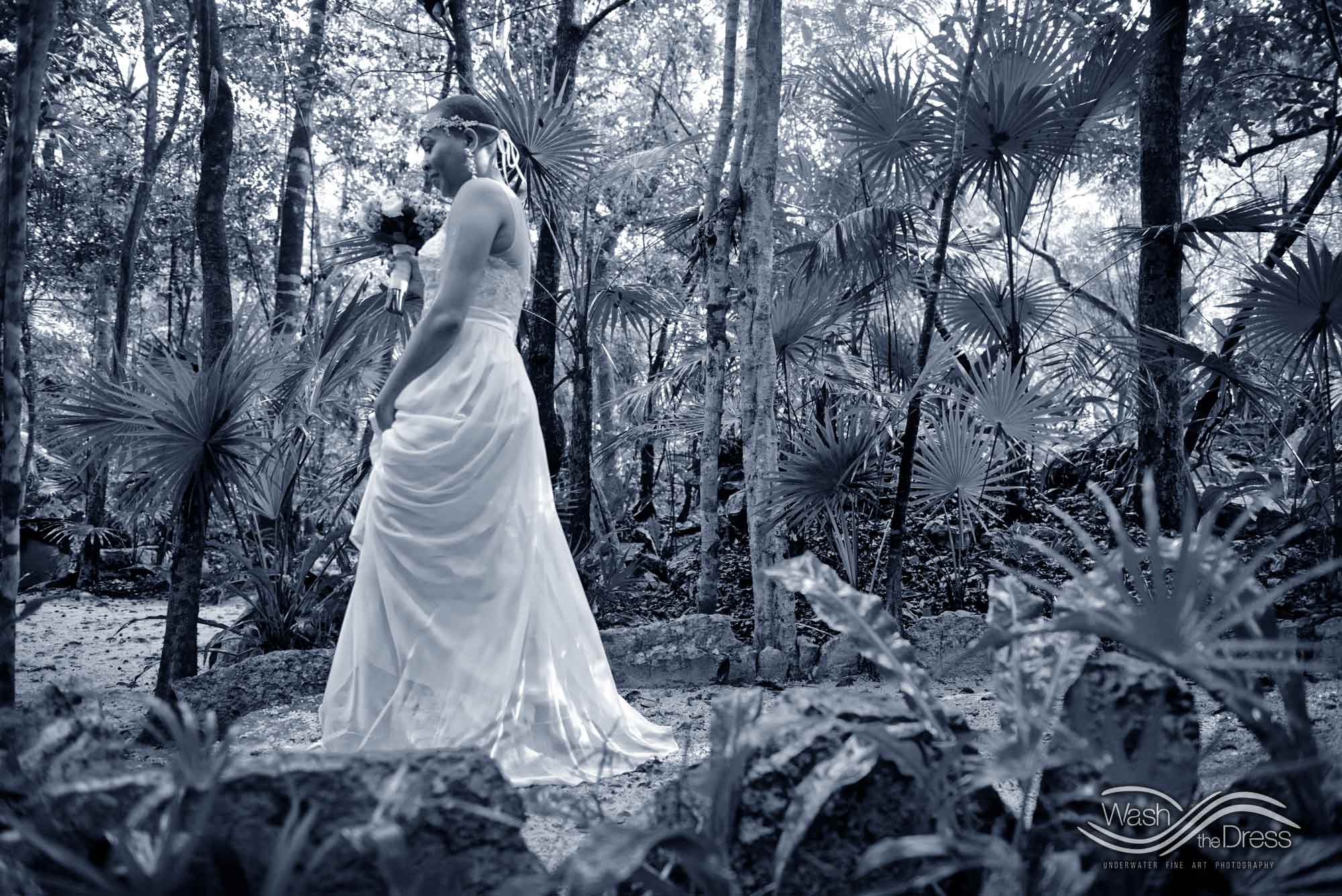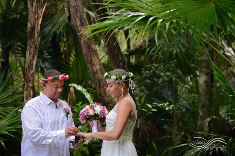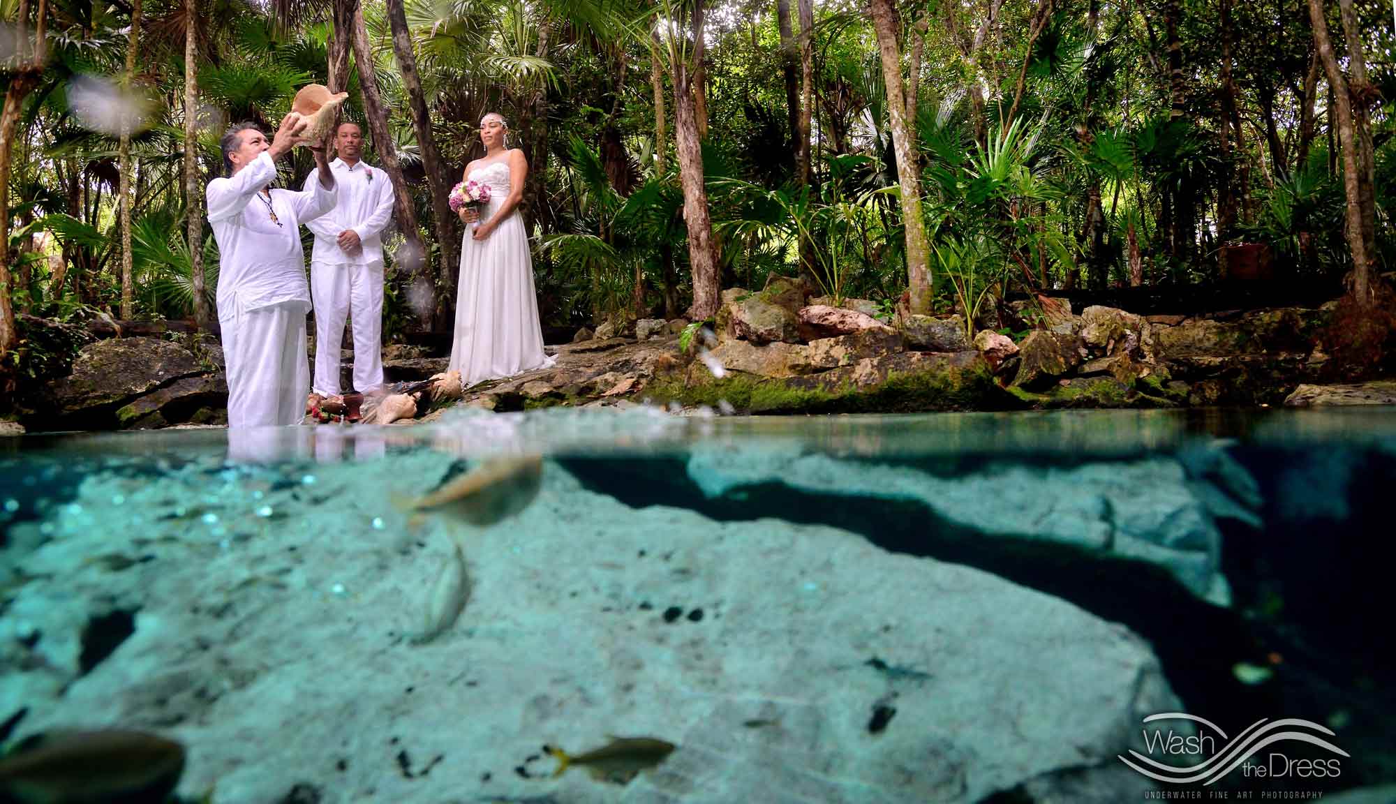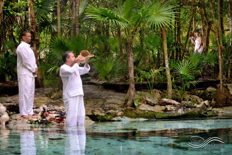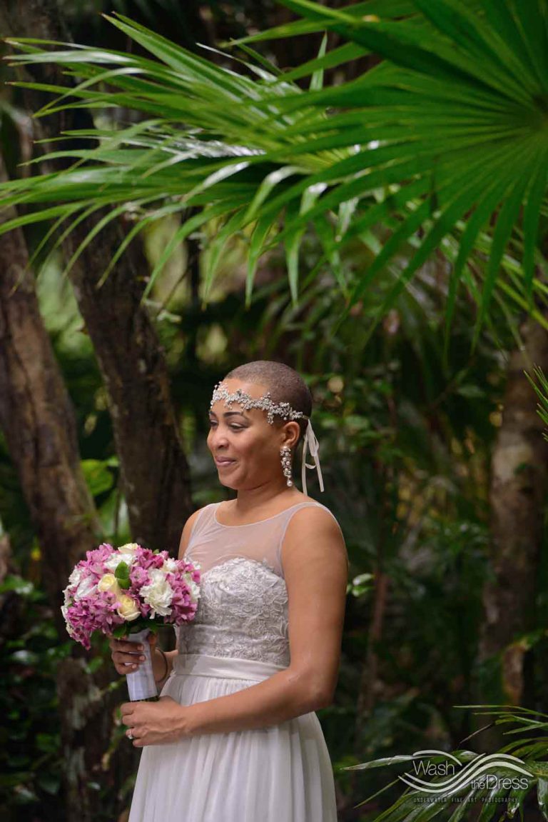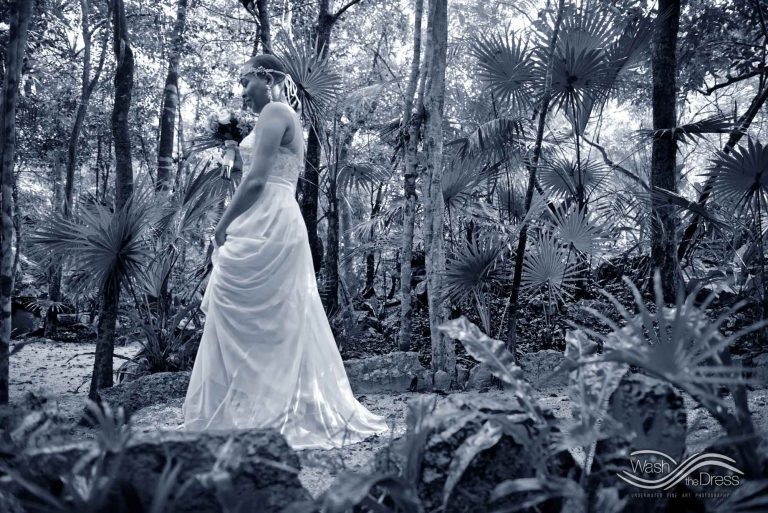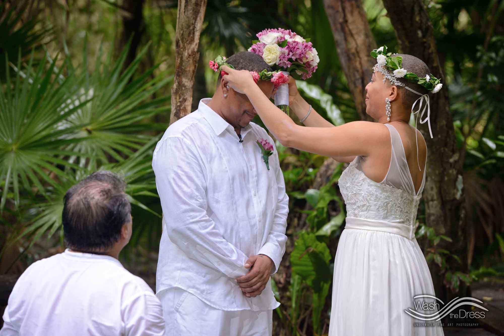 Shareefah and Victor came to Cancun to get married at an intimate ceremony at a cenote. The ceremony was conducted by a Maya shaman. A ray of sunlight passed between the trees during the ceremony and shone directly on the couple – it was a magical moment in the heart of the Mexican jungle. Of course, after the ceremony we also did a photo shoot in the waters of the cenote.